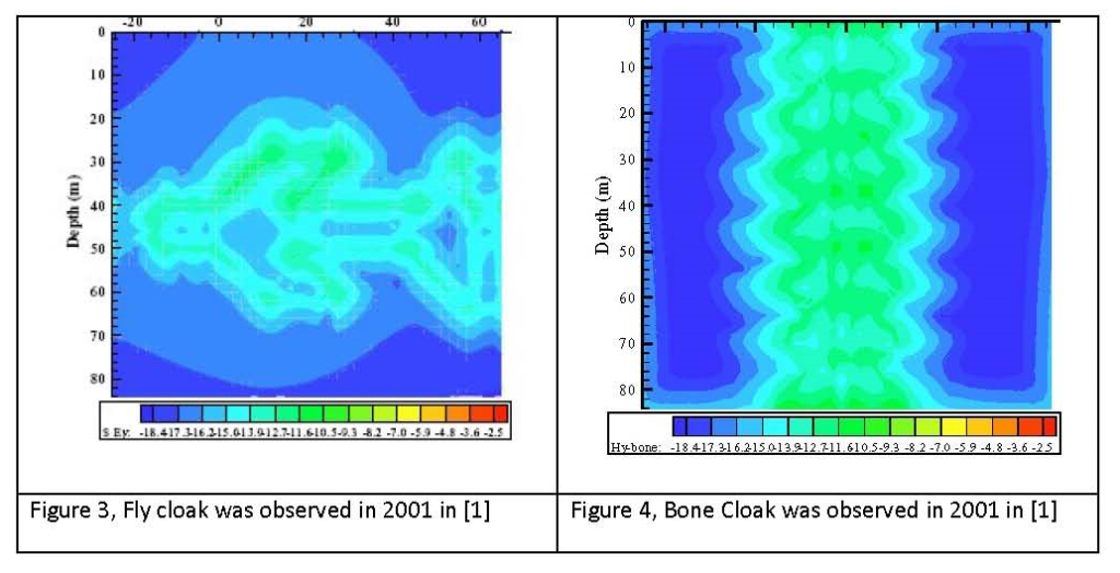 By calculations, when Ri = 0. 2491 meter and Ro = 0. 47 meter, we prove that on the outer boundary of the cloak , and in (2) – (5) satisfy the condition for any exterior source and frequency. Therefore, any exterior EM wave field must not be scattering -interfered by the cloak. By the 3D GL EM modeling [ 2 ] simulations, electric wave propagations in Figures 5–18 verify that there is There is no reflection and no scattering from the cloak to interfere with the exterior EM field in free space.